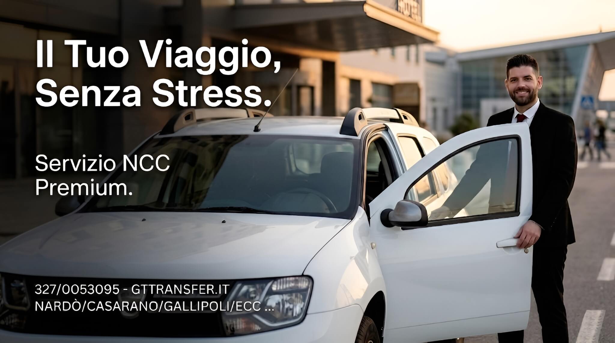 GT Transfer è il servizio n° 1 in Puglia per il Noleggio di auto con Conducente in provincia di Lecce, attivo in tutta Italia, per raggiungere tutte le tue destinazioni preferite, che siano esse da/per aeroporti (come Brindisi o Bari), stazioni ferroviarie (come la stazione di Lecce), porti marittimi tra cui il porto di Gallipoli, hotel, ristoranti, bed and breakfast, case vacanze, spiagge e molto altro, incluso un’esclusivo tour panoramico del Salento su prenotazione!